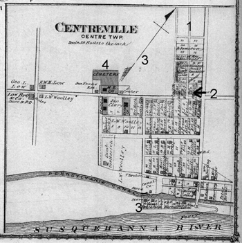 Daniel also bought the land south of Centreville between the canal and the river, adjacent to the canal basin where boats tied up. The deed specifies that one corner of the property lies in the middle of the bridge over the canal. He sold this lot in 1863 to neighbor Peter Miller, and the 1876 map shows fourteen lots there fronting the canal towpath. Daniel probably had hoped that a boat yard for building canal boats would be developed on his land, but the village of Espy, a few miles downriver, captured the lion’s share of the boat-building business.